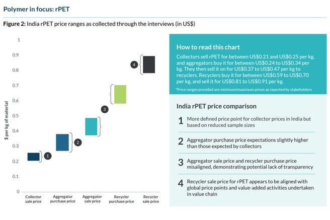 印度、東南亞的廢塑料原料和再生塑料價格缺乏透明度,導(dǎo)致需求和供應(yīng)波動,再生設(shè)施產(chǎn)能利用率低,最終對品牌商履行其塑料包裝中再生材料承諾構(gòu)成挑戰(zhàn)。 價格數(shù)據(jù)至關(guān)重要,在缺乏數(shù)據(jù)的情況下,品牌商和其他再生塑料買家設(shè)定的目標(biāo)將脫離市場。